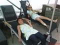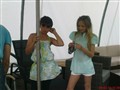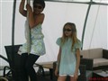 Fevzie har tunika med glittertrådar och jeansleggins. Michelle har turkos tunika med glittertrådar och vita shorts.